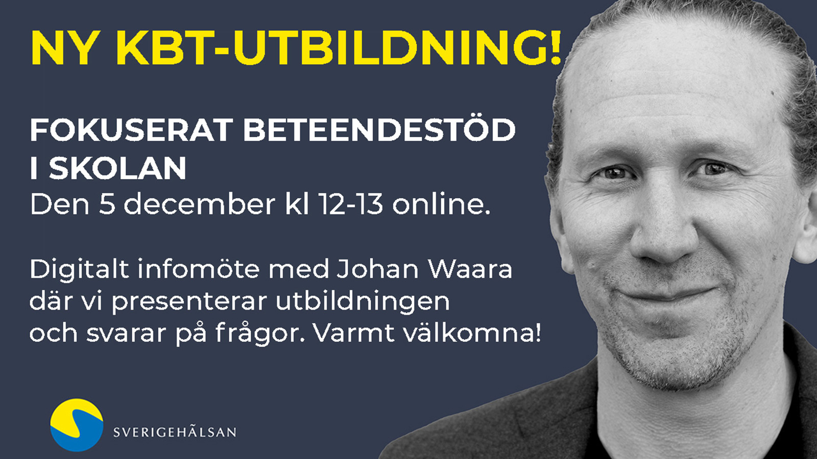 Nytt tillskott i familjen KBT-utbildningar på Sverigehälsan - fokuserat beteendestöd i skolan! En 6 dagar lång utbildning som vänder sig till dig som arbetar med barn och unga i skolan. Johan Waara leder utbildningen.